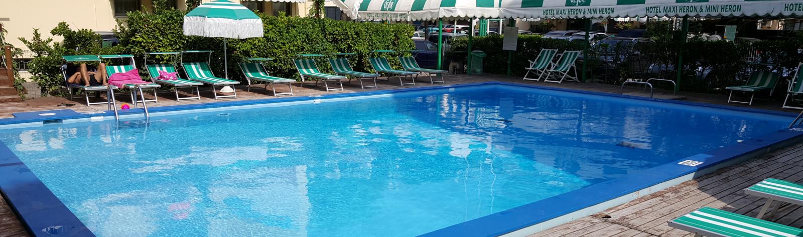 Hotel MiniHeron, 3 stelle a Lido di Jesolo, a due passi dal mare, dispone di una propria ampia piscina per adulti con terrazza bar e utilizzo gratuito dei lettini a bordo piscina.